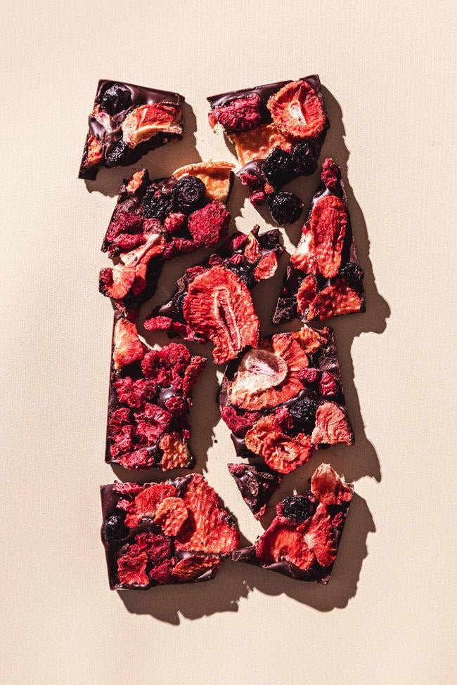 Compartés California Berries bar dark chocolate bar brings you the taste of spring with every bite. A deep dark chocolate studded with all natural dried strawberries, raspberries and blueberries. The most beautiful berry bar you'll ever see... and eat! Handmade in our Los Angeles chocolate kitchens.