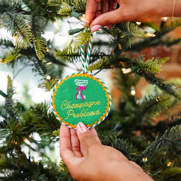 For the ones who know that personality belongs on the tree. This cheeky needlepoint ornament celebrates your favorite thing—champagne.