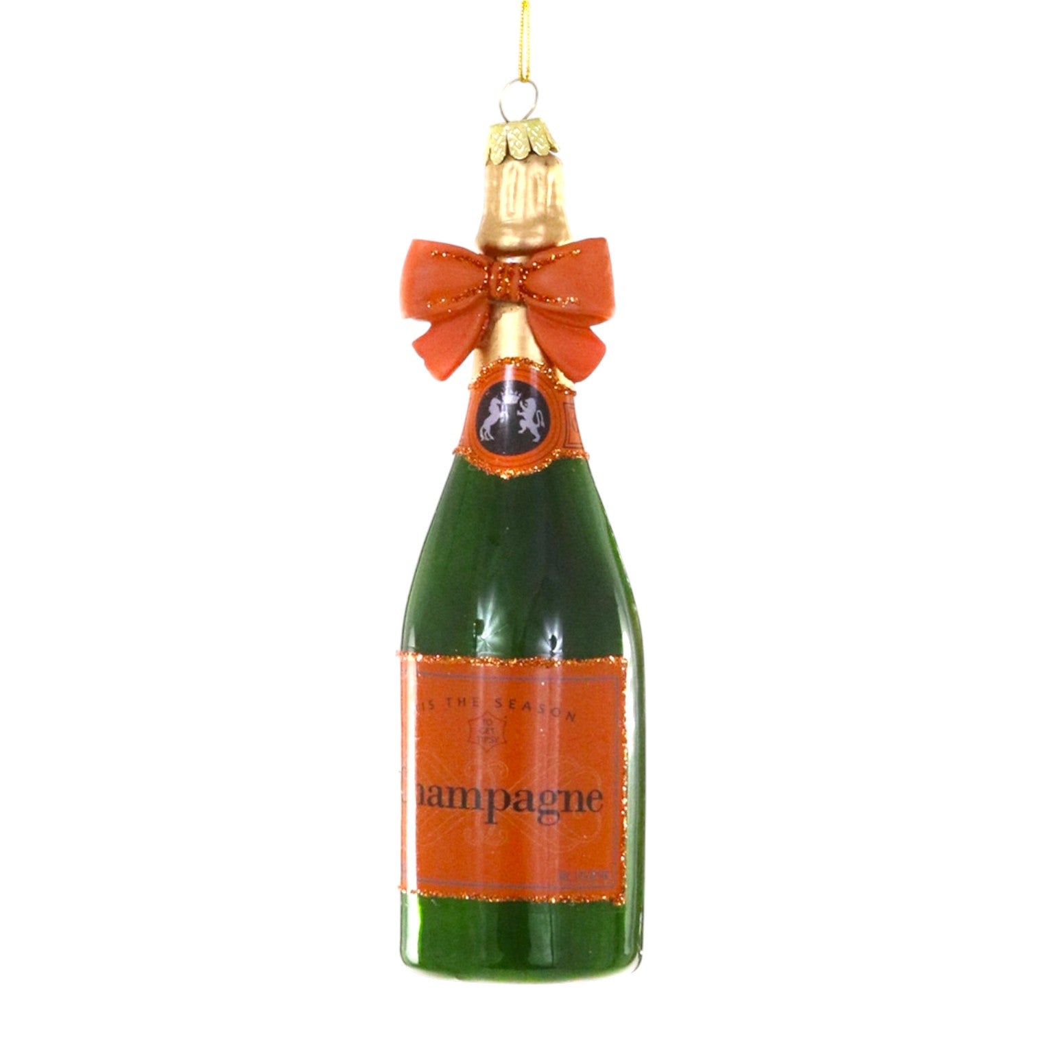 The perfect addition to any tree. An iconic bottle of champagne with an orange bow inspired by Veuve.