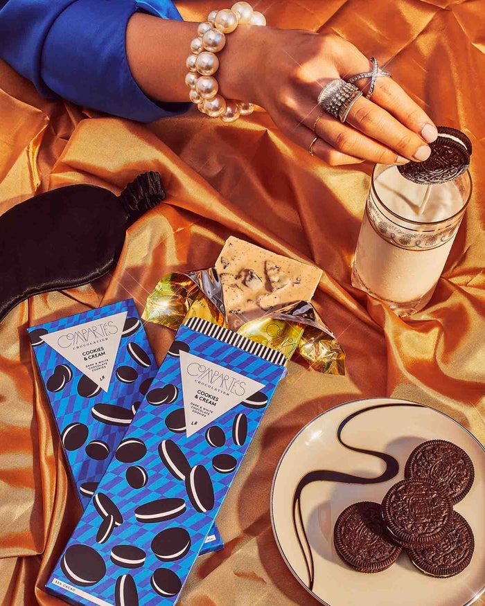 Compartés's amazing Cookies & Cream chocolate bar is unbeatably delicious! Using our new proprietary blend of white and dark chocolate, packed full of sandwich cream cookies, this chocolate bar may be our favorite chocolate creation yet! You must try this unique bar! Handmade in our Los Angeles chocolate kitchens.