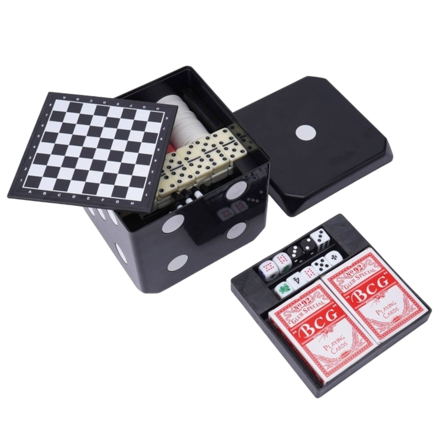 This handy compact cube includes all the games you need for a fun night in! Enjoy playing Checkers, Chess, Dominoes, Backgammon, Poker, Playing Cards and Dice.