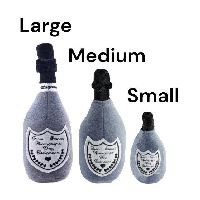 Dog Perignonn Champagne Bottle Plush Toy For your pampered pooch’s consideration: our finest bottle of Dog Perignonn! It features a plush exterior with a squeaky inside that’s sure to uncork the fun! Your pup will bubble over with excitement with this toy that’s available in just their size: small, large, and extra large!