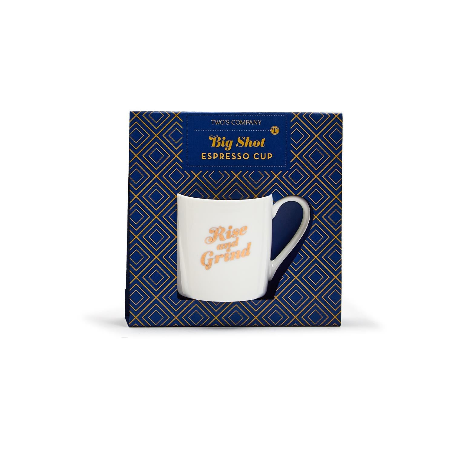 - Each espresso cup in this set comes with a clever and relatable saying: "Sip Happens," "Rise and Grind," "Hot Stuff," and "Big Shot"