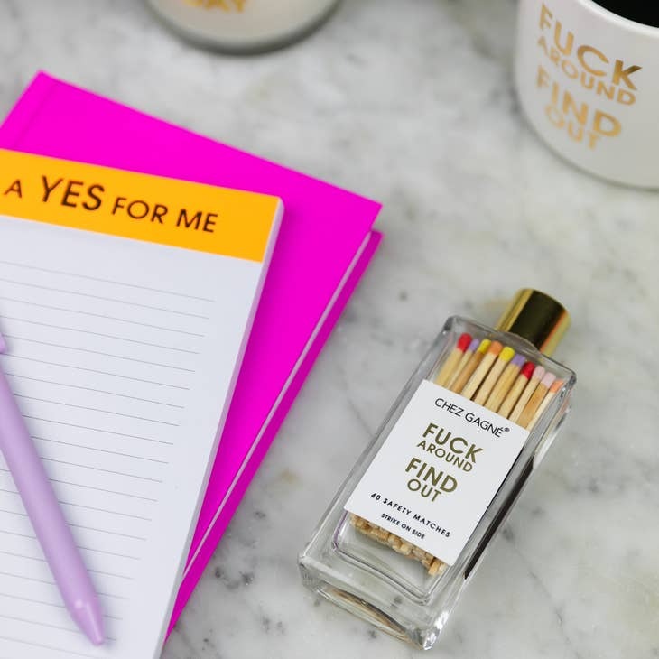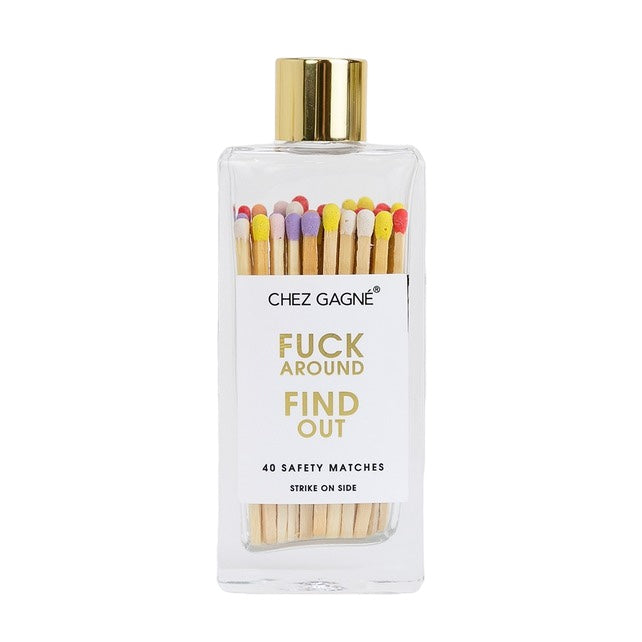 Fuck Around Find Out - Glass Bottle of 40qty Assorted Rainbow Color Tipped Safety Matches 1.84 x 4.75, 1.8oz Glass Bottle with Gold Lid contains 40qty Wooden Matches