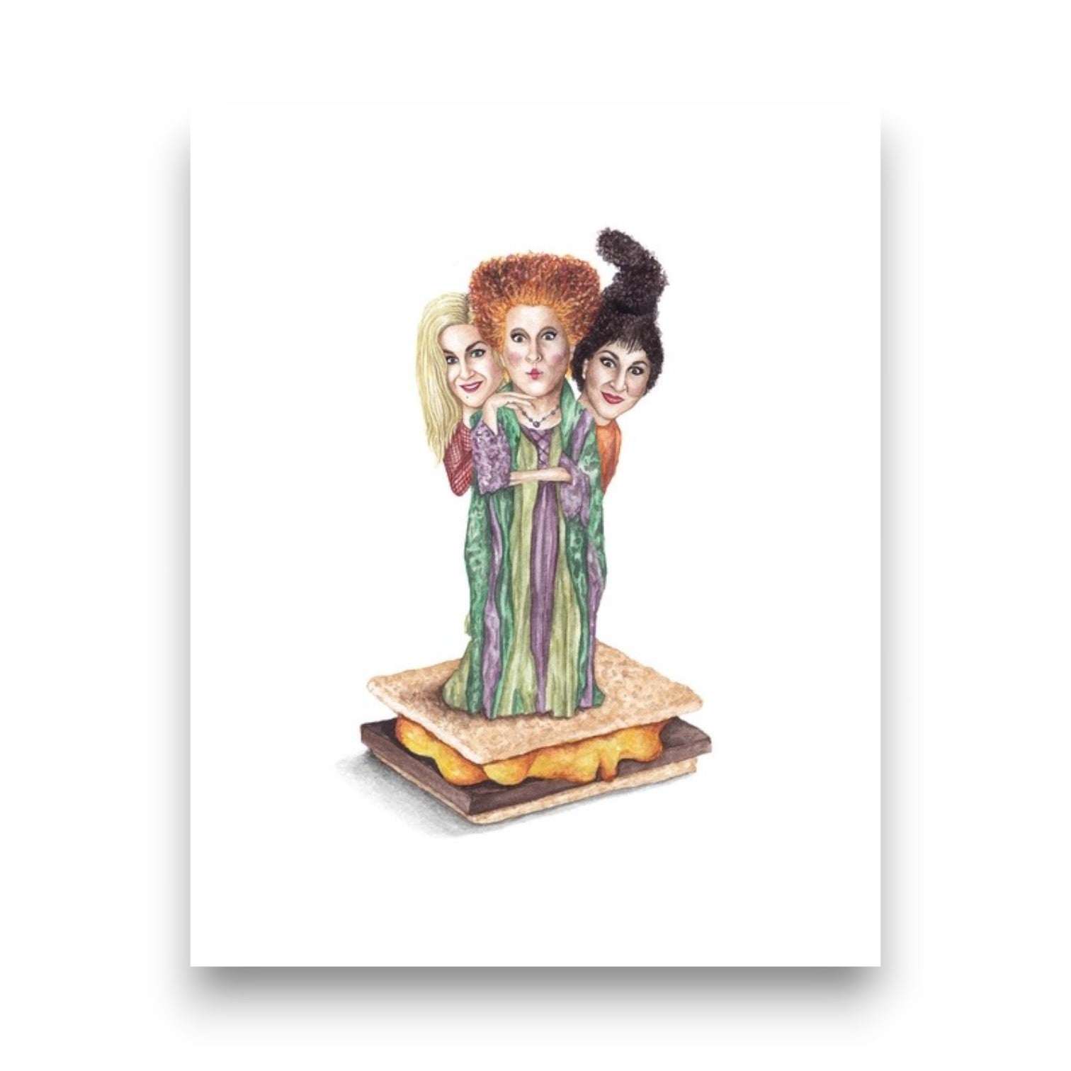 8"x10" watercolor print of Bette Midler, Sarah Jessica Parker, and Kathy Najimy from Hocus Pocus on a melted candy corn s'more sandwich.