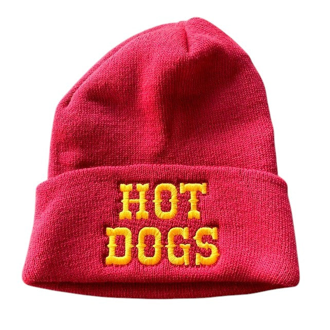 Burgundy knit beanie with golden yellow " HOT DOG" embroidery