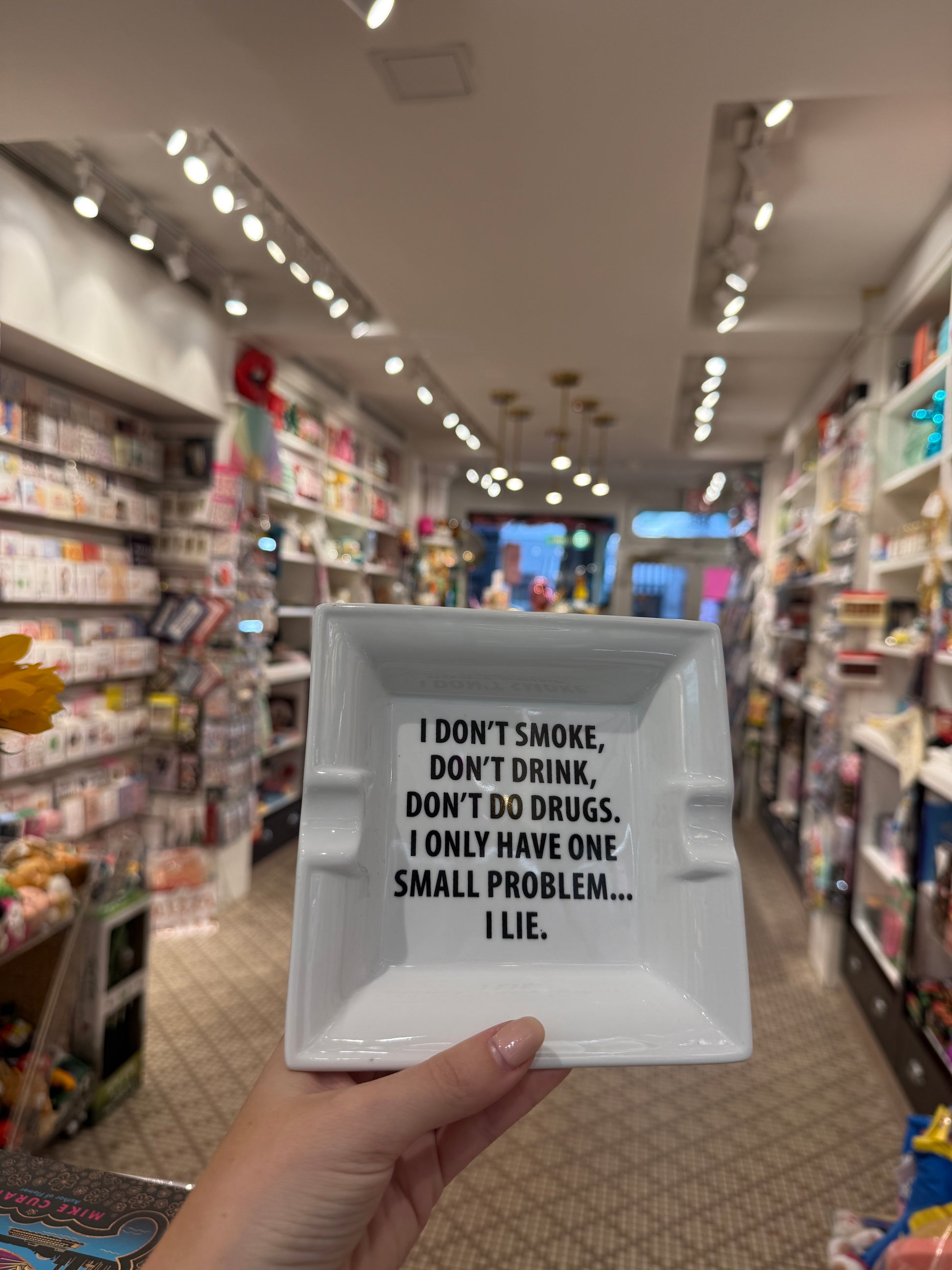 Ceramic ashtray reads: "I don't smoke, don't drink, don't do drugs. I only have one small problem...I lie."