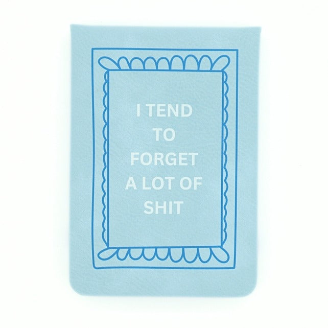 The cover is made of a soft padded leatherette material and the print is embossed. It reads “I Tend to Forget A Lot of Shit” in white text on a light blue background and a blue border.