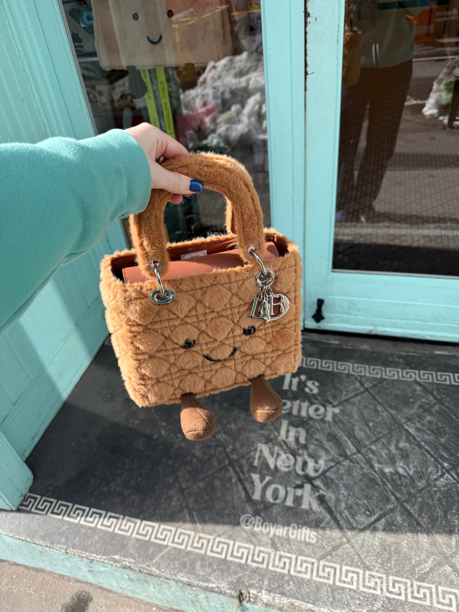 It’s a small, structured top-handle handbag in a warm caramel/cognac tone, fully covered in plush faux-fur with an allover quilted diamond pattern. The texture gives it a soft, teddy-bear feel while the classic quilting silhouette keeps it polished and elevated.