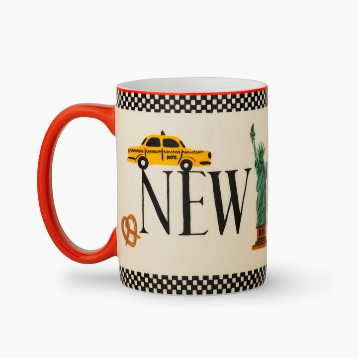 New York inspired full-color illustration 16 oz. ceramic mug. Includes all your favorite NYC icons: taxi, pigeon, coffee cup, Broadway sign, statue of liberty, pretzel, and the big apple of course.