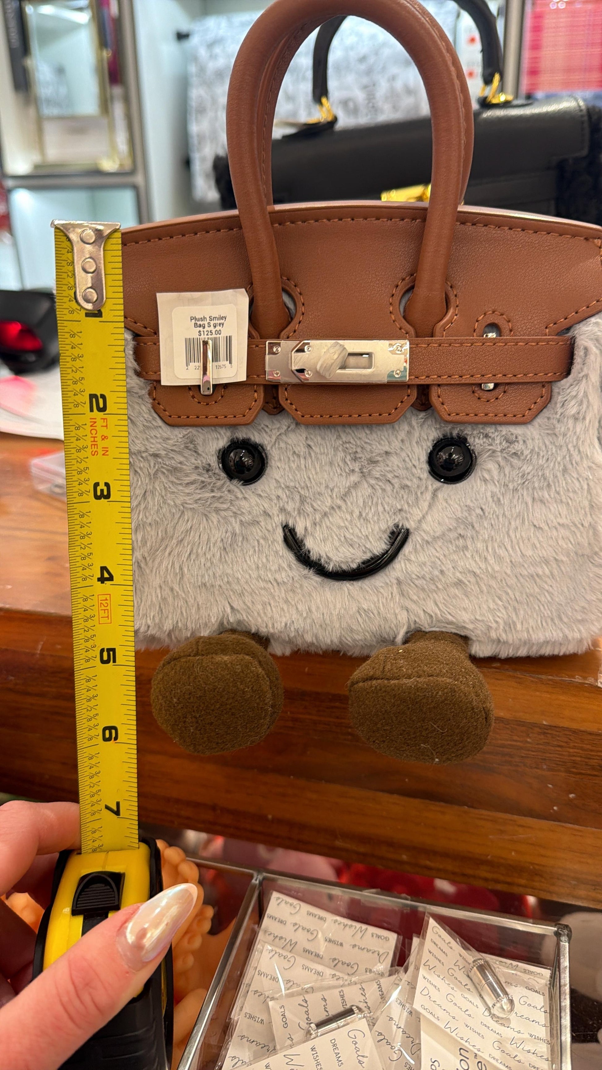 - Design: A fuzzy body with a stitched smiley face gives it a soft, toy-like charm, while the structured top mimics a classic luxury handbag silhouette.