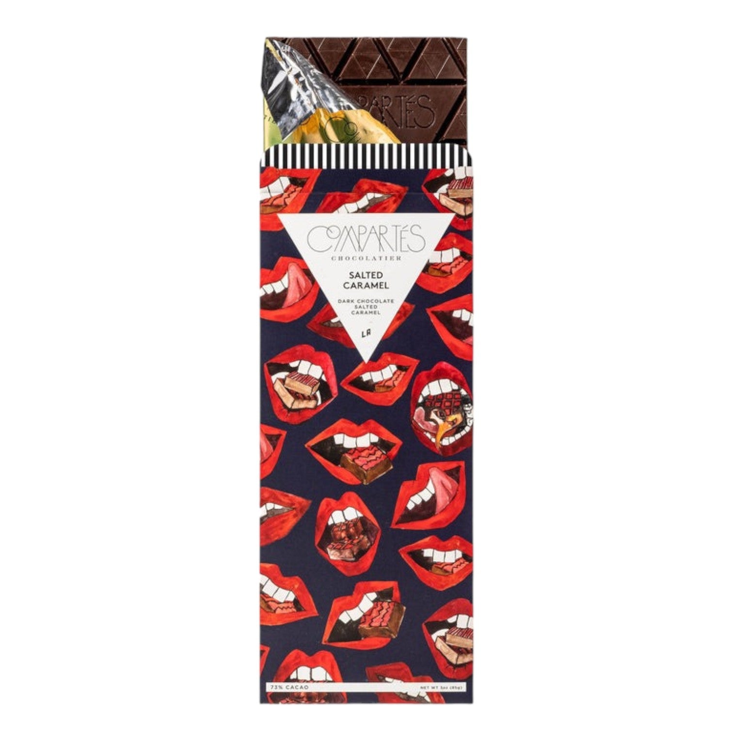 Compartes BRAND NEW gourmet chocolate bar Salted Caramel. The unforgettable combination of Compartés Sea Salt Caramel blended into our signature dark chocolate a rich, sweet and salty sensation unlike another caramel bar in the world. This sea salt caramel infused luxury dark chocolate is one of our best sellers! Featuring Compartés hand drawn artistic lips biting into caramels, this bar is as delicious as it is beautiful! Caramel is mixed into the dark chocolate to create this delicious chocolate bar then it’s flecked with sea salt for a crunchy caramel snap.
