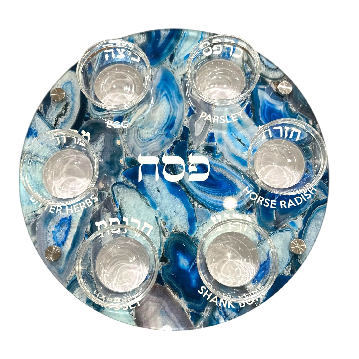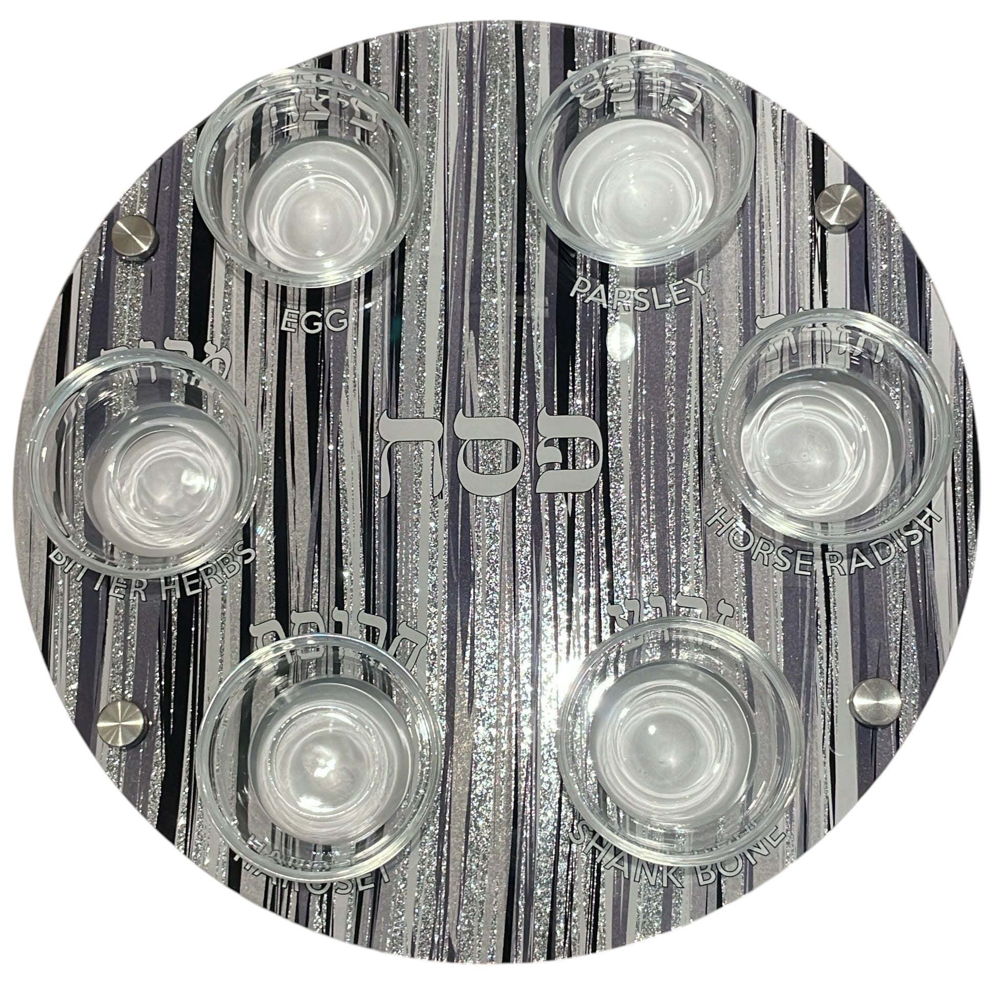 A modern take on the traditional passover seder plate. Plexiglass agate design with both Hebrew and English writing. 6 removal glass bowels and 4 metal risers.